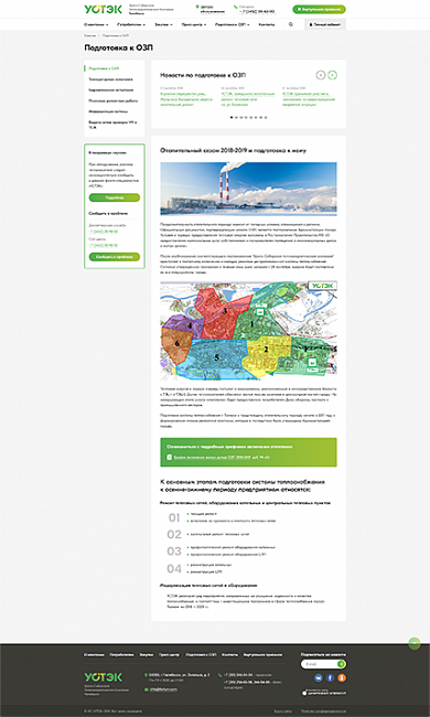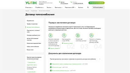 На сайте было необходимо отобразить большой объем информационных материалов о компании и ее деятельности, применяемых тарифах на тепловую энергию, приборах учета, порядке подключения к тепловым сетям, центрах обслуживания клиентов и так далее, с учетом требований законодательства Российской Федерации.